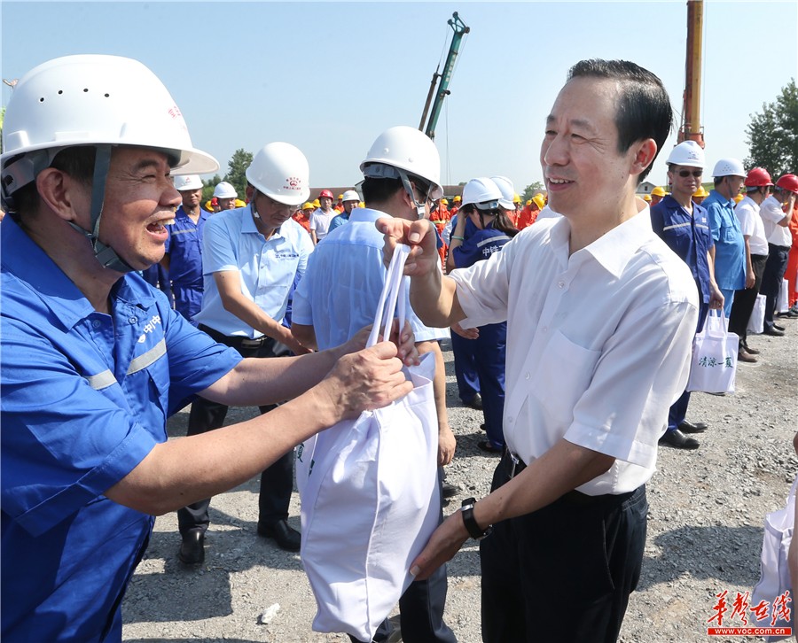 7月23日上午,省委副书记、省长许达哲来到常益长高铁控制性工程沅江特大桥项目现场,看望慰问一线建设者,送去清凉解暑物资。湖南日报记者赵持 摄